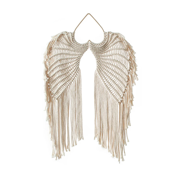 Elevate your space with the Angel Wings Hanging Wall Decor, expertly crafted in macrame for a delicate yet striking aesthetic. This piece adds texture and a serene, ethereal touch to any room, making it ideal for enhancing your interior with subtle artistry. Perfect for those seeking a refined, handcrafted accent that blends seamlessly with modern and bohemian styles.
