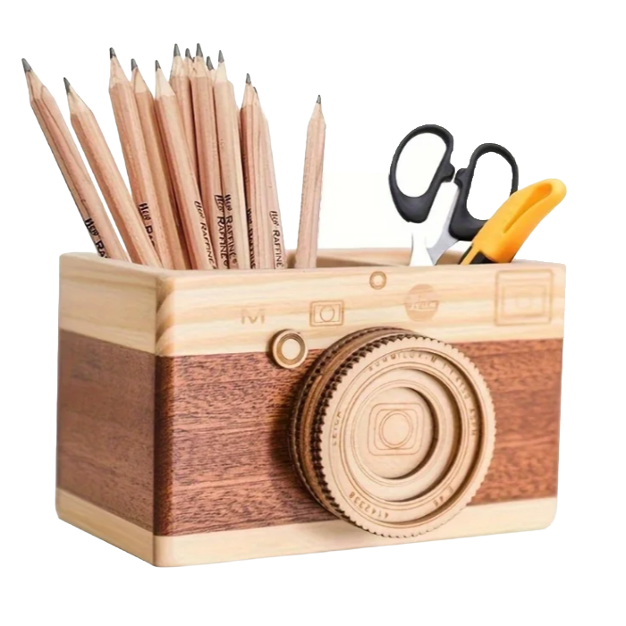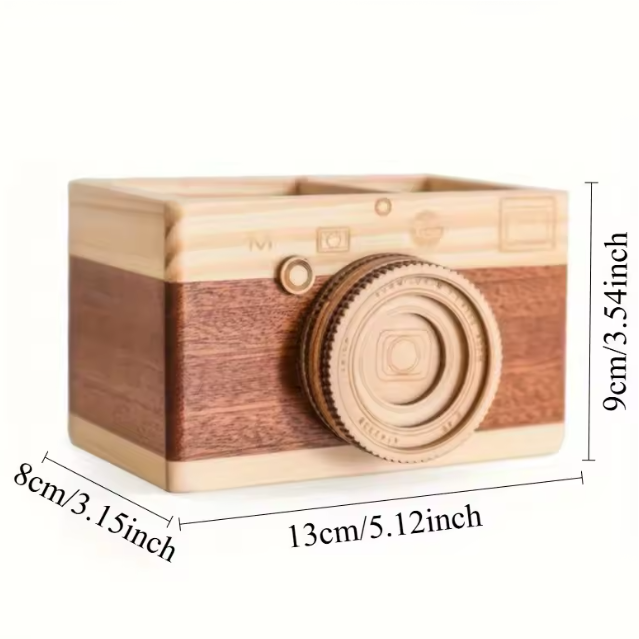 Bring nostalgic charm to your desk with this vintage camera pencil holder. Crafted with retro appeal, it doubles as functional storage and eye-catching room décor. Perfect for keeping pens, pencils, and brushes organized while adding character to your workspace or shelving display. An ideal accent piece for anyone who loves vintage aesthetics and practical design solutions.